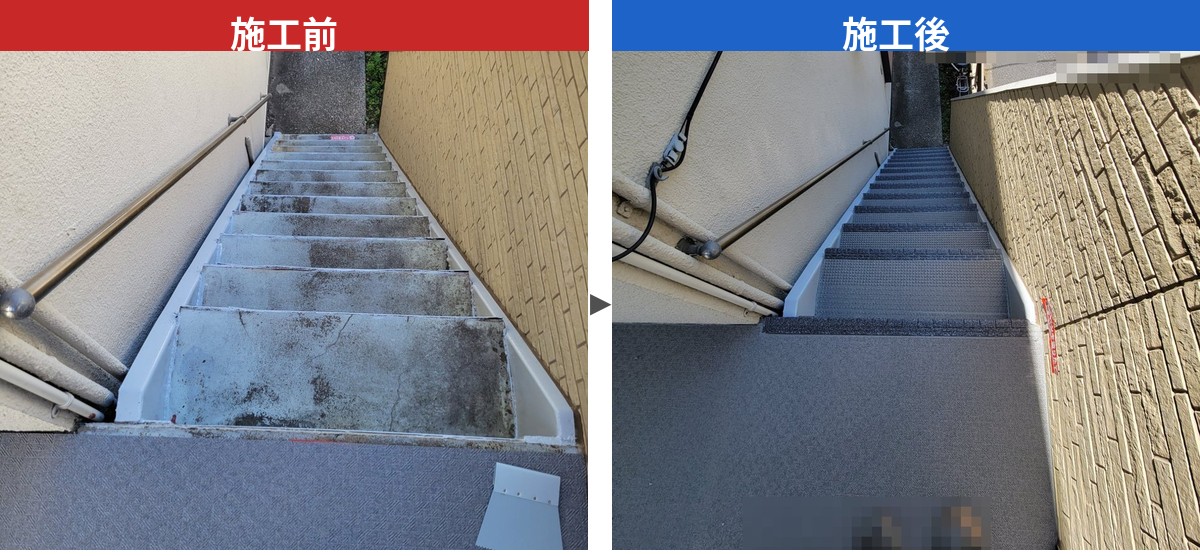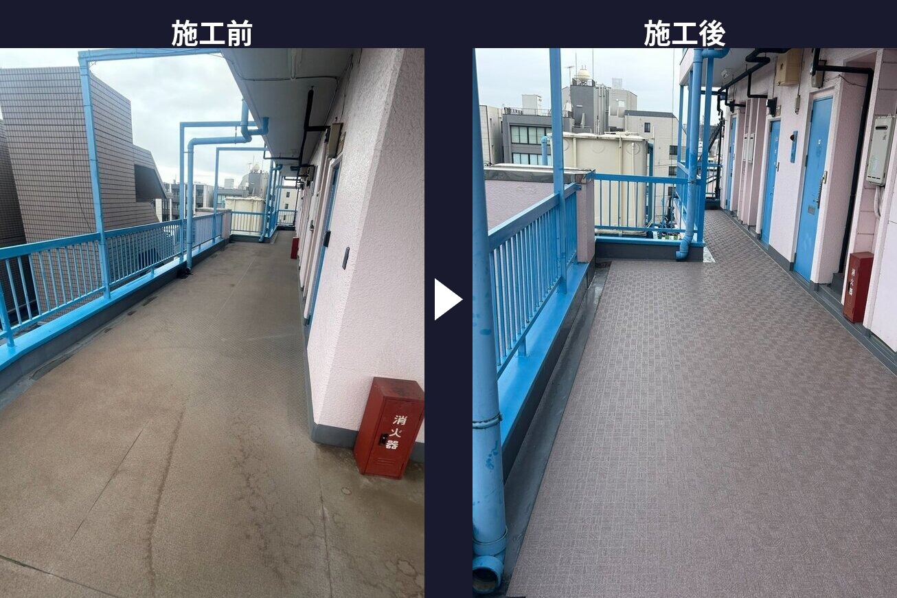 廊下・階段・バルコニーの床材貼り替え。滑り止め効果と美観性を両立し、共用部の印象を一新します。