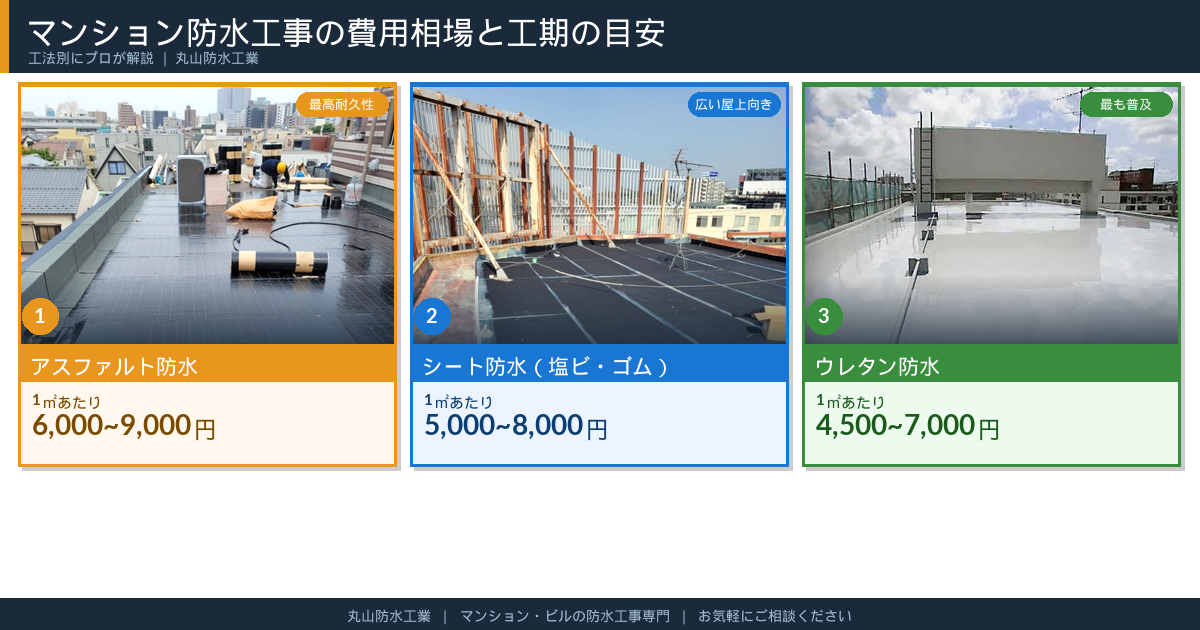 マンションの防水工事は工法によって費用が異なりますが、1㎡あたり4,500〜9,000円が相場です。丸山防水工業では、建物の状態に合わせた最適な工法をご提案し、明確なお見積もりをお出ししています。マンションの防水工事をご検討の方は、お気軽にご相談ください。